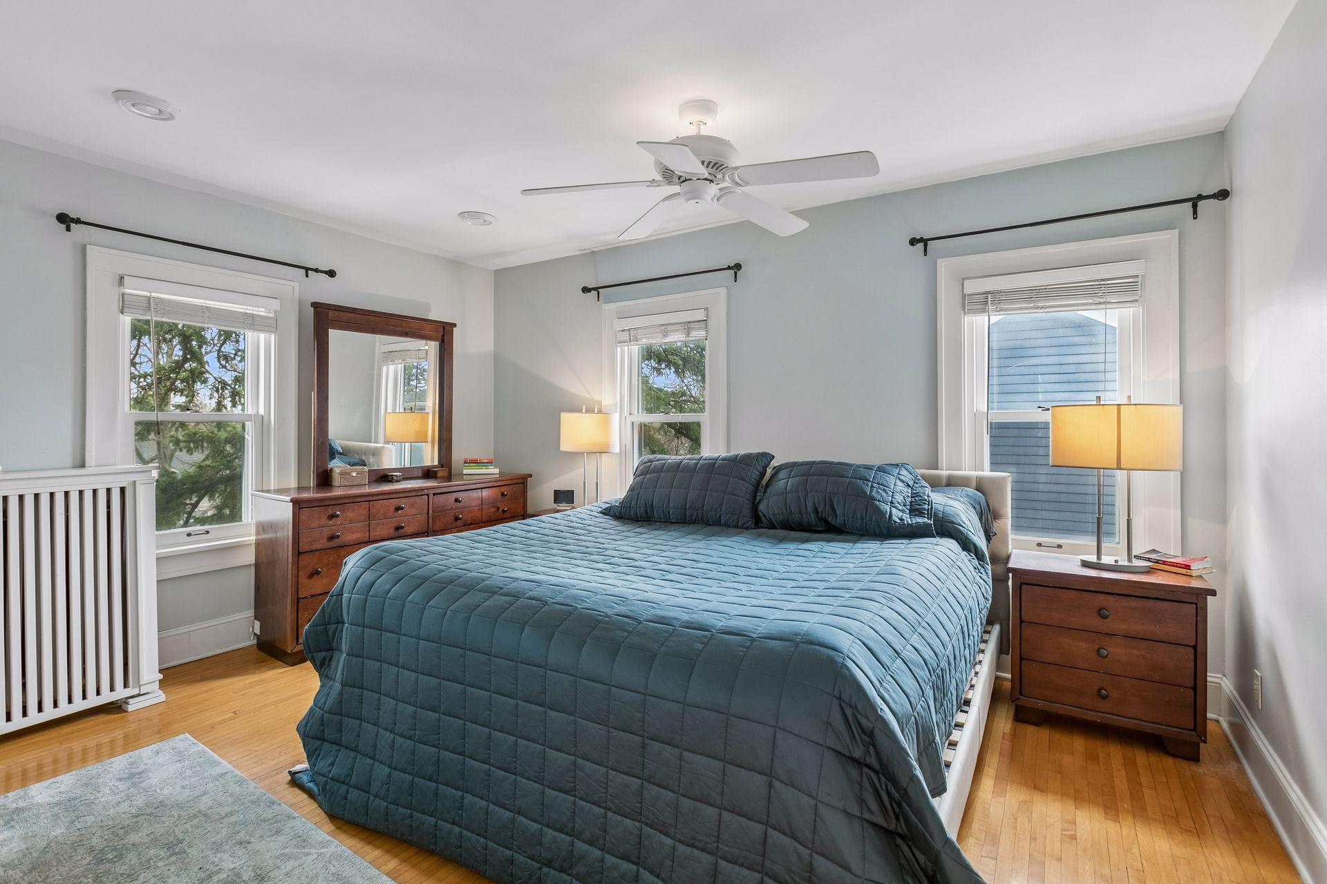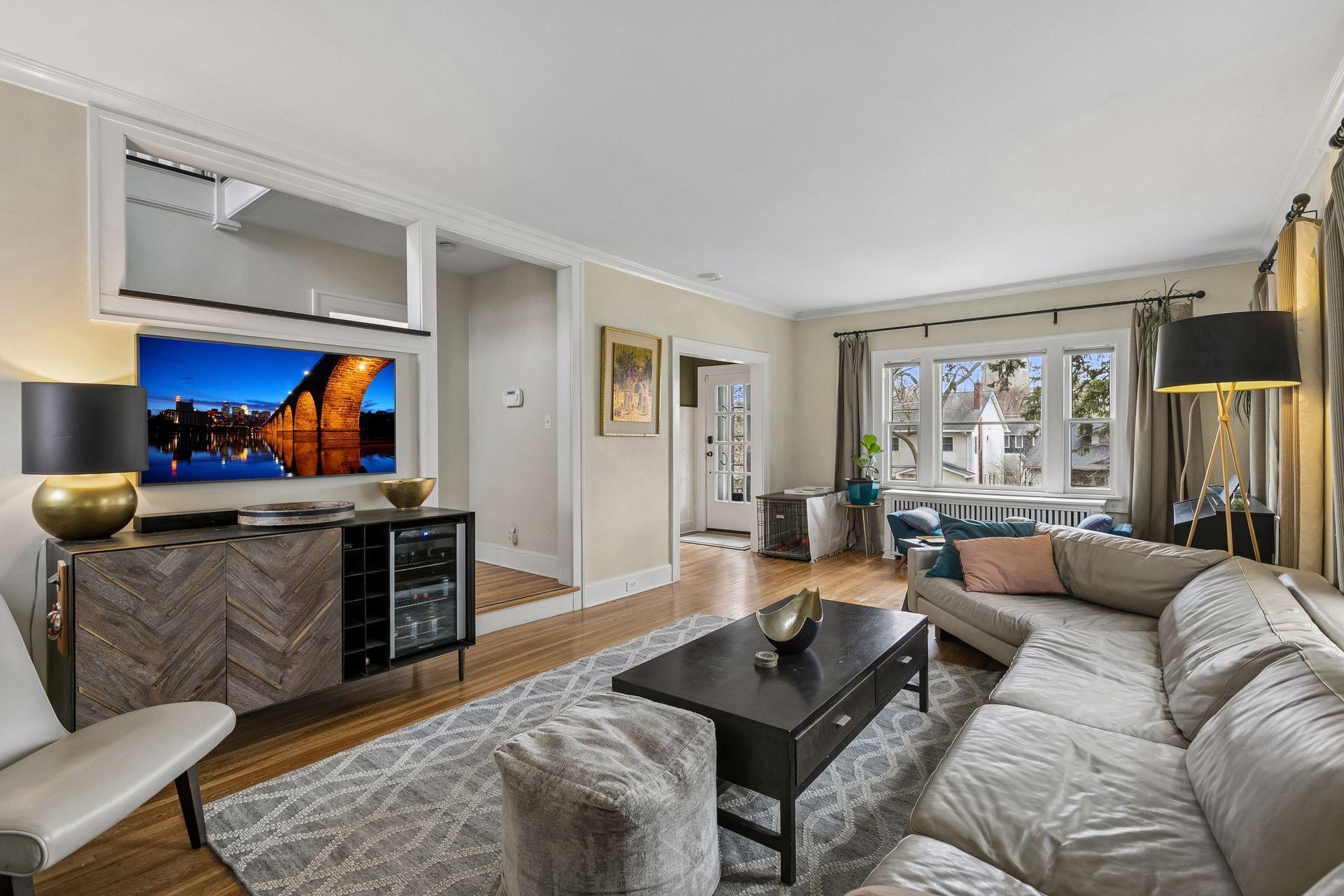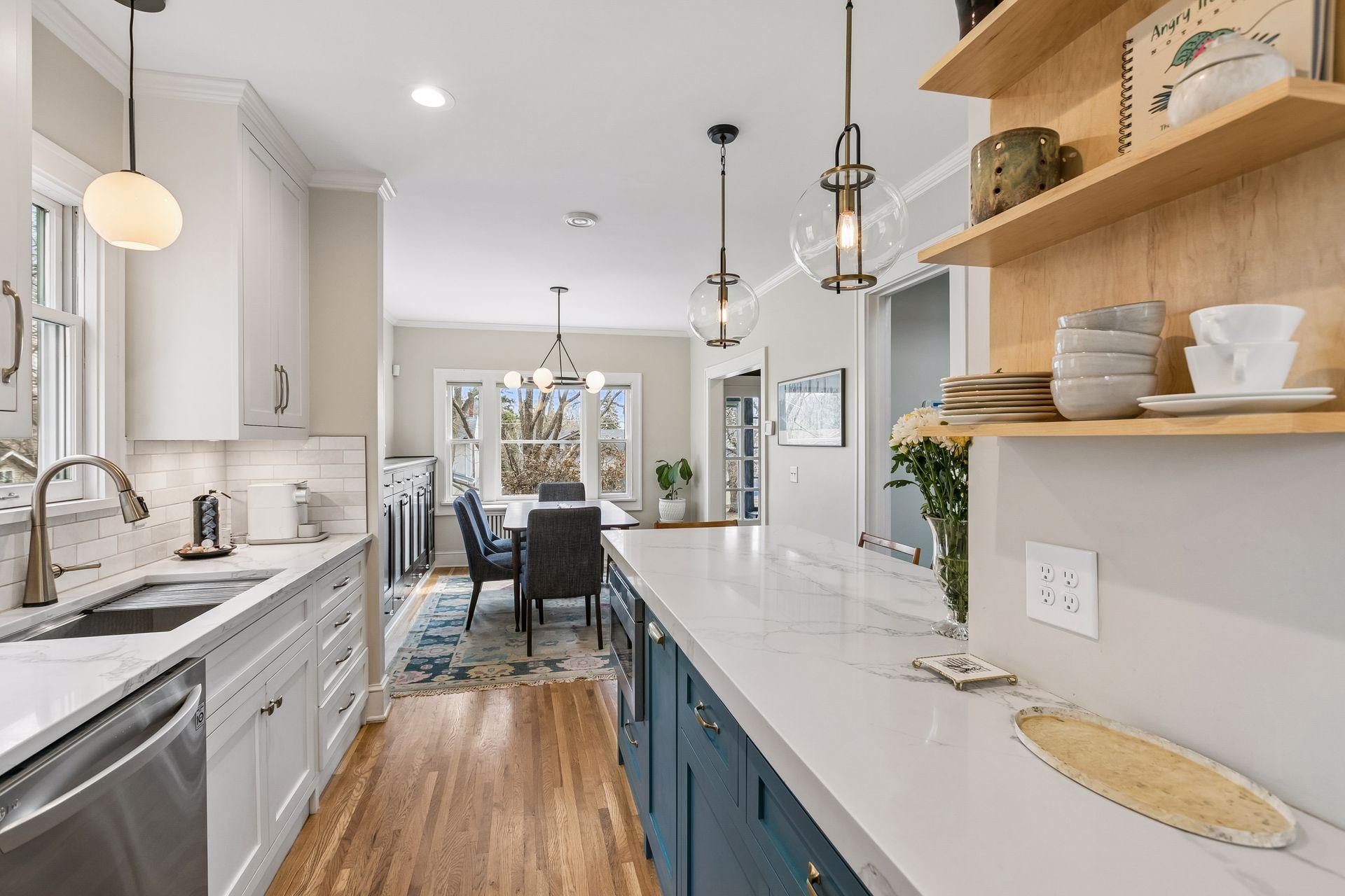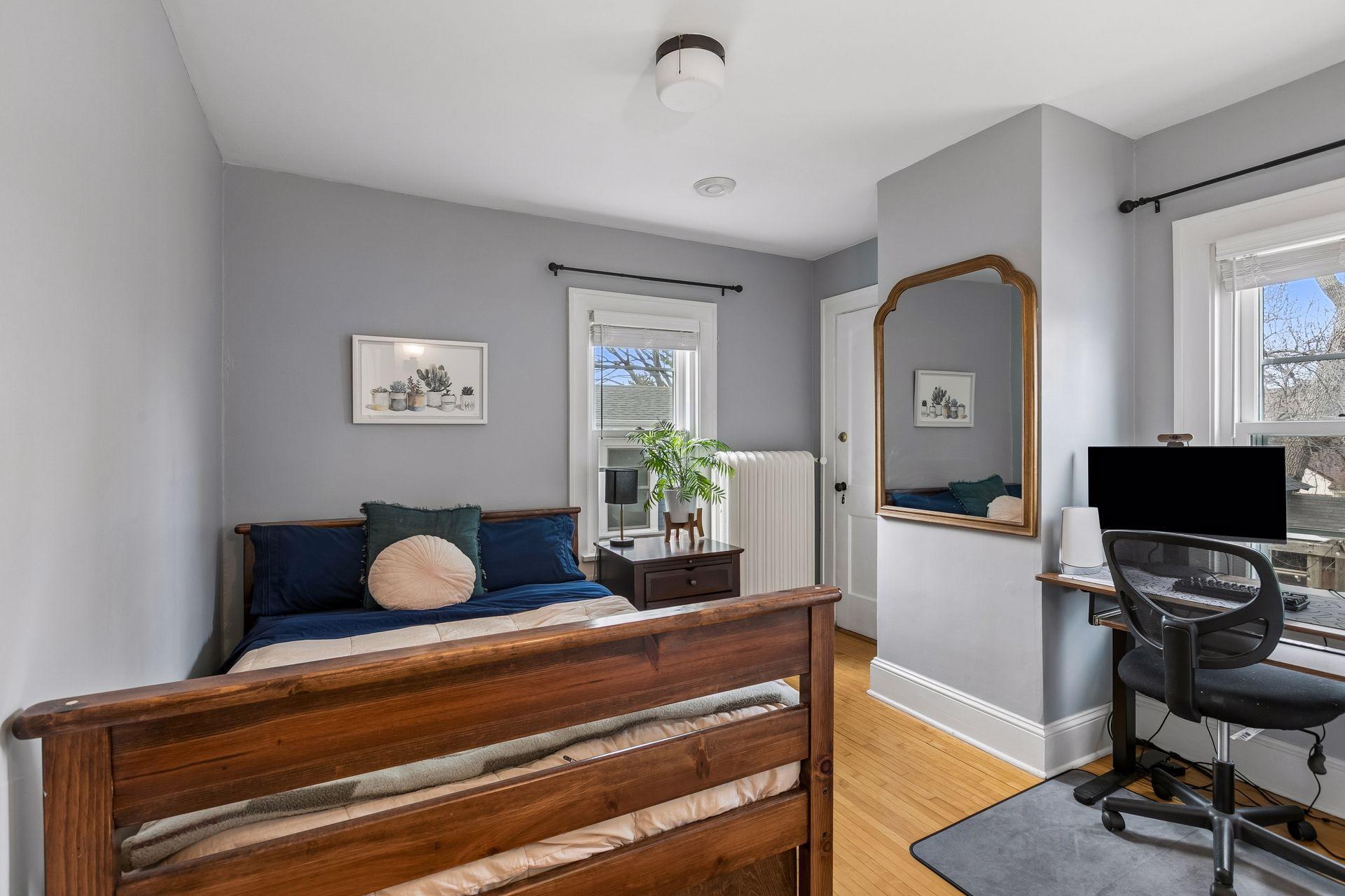 Inside, the home blends classic charm with modern updates. The custom kitchen (2022) includes new insulation, plumbing, and a quartz island. Original character shines with restored front windows and a built-in buffet, complemented by updated windows with added noise insulation.