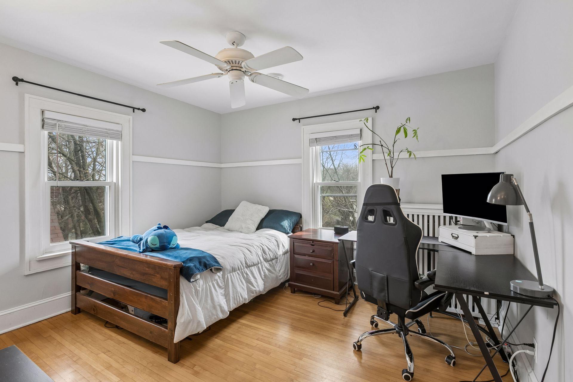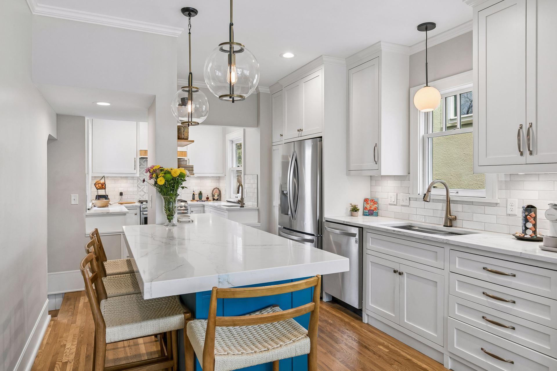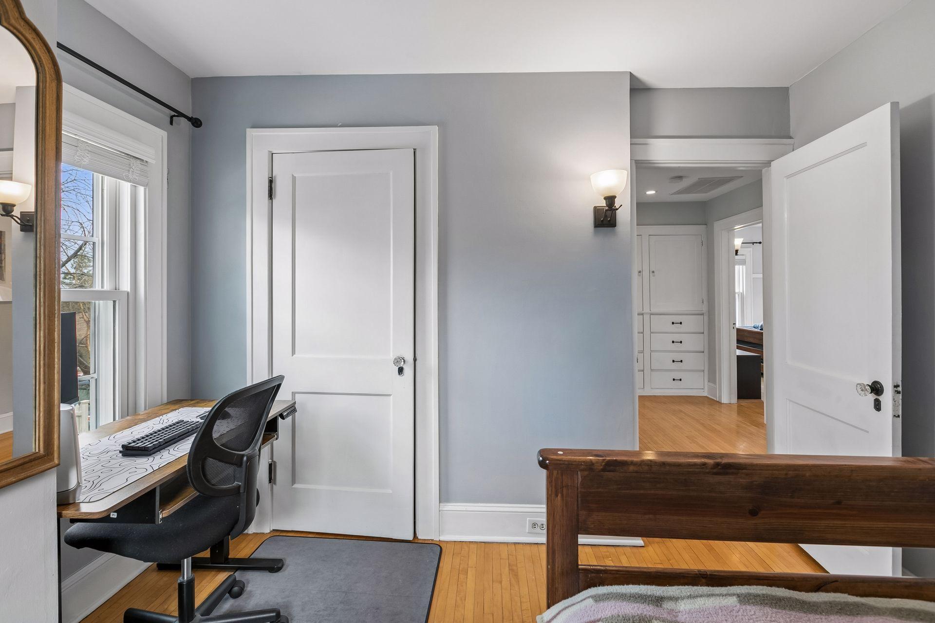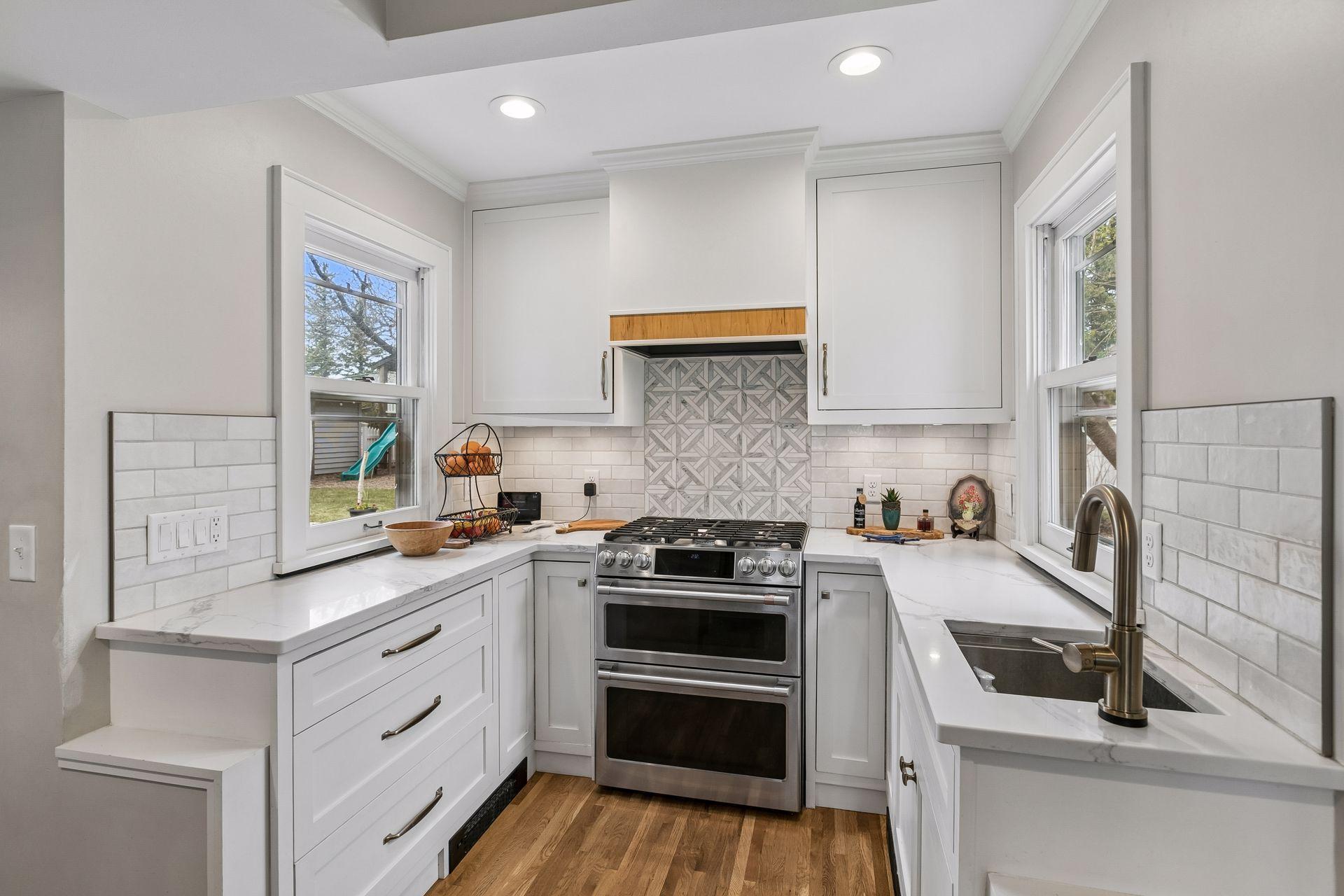 Inside, the home blends classic charm with modern updates. The custom kitchen (2022) includes new insulation, plumbing, and a quartz island. Original character shines with restored front windows and a built-in buffet, complemented by updated windows with added noise insulation.