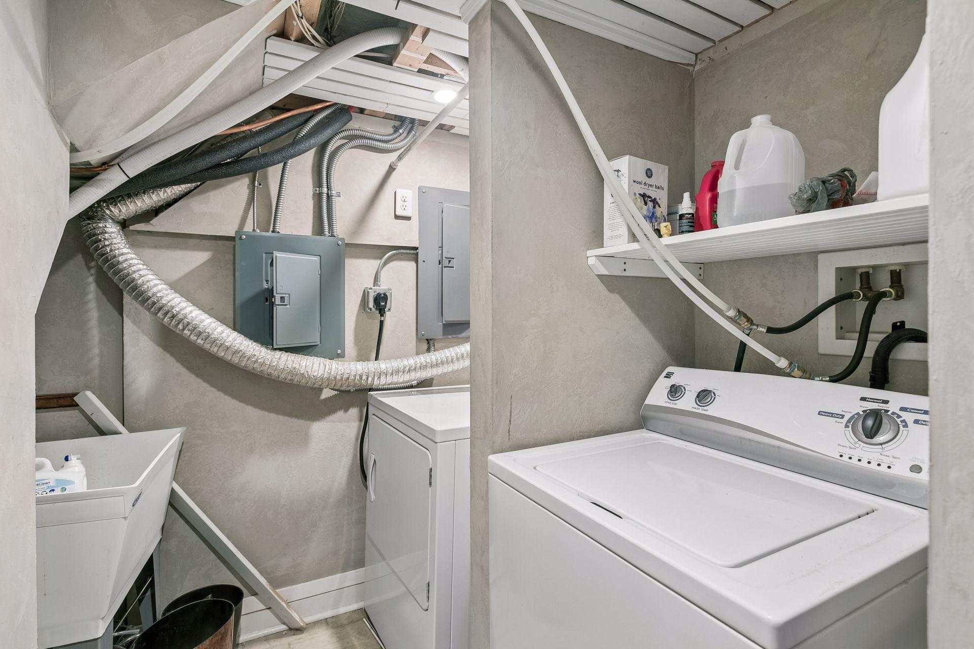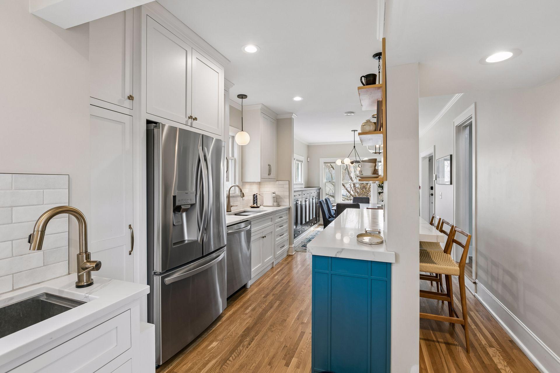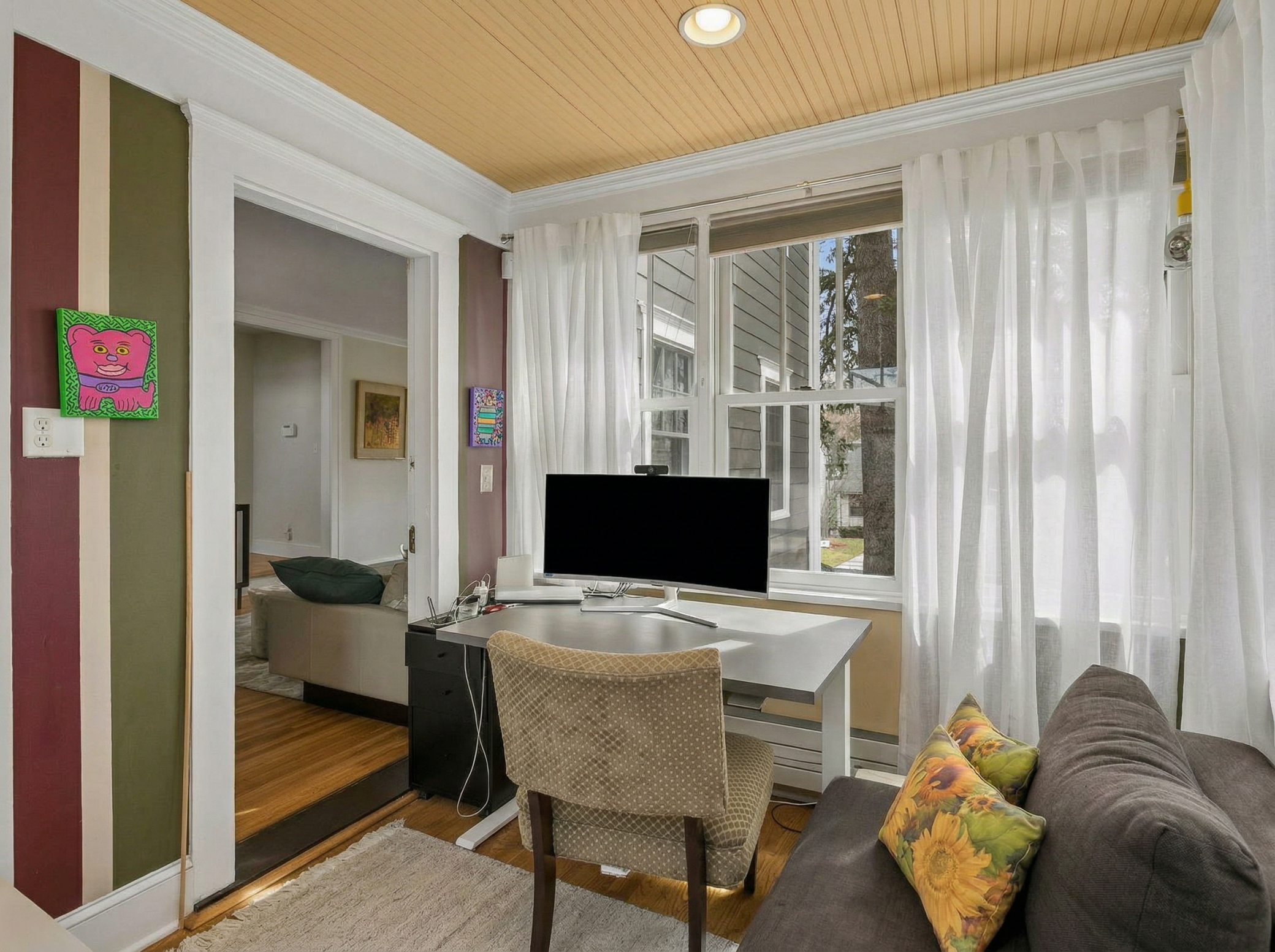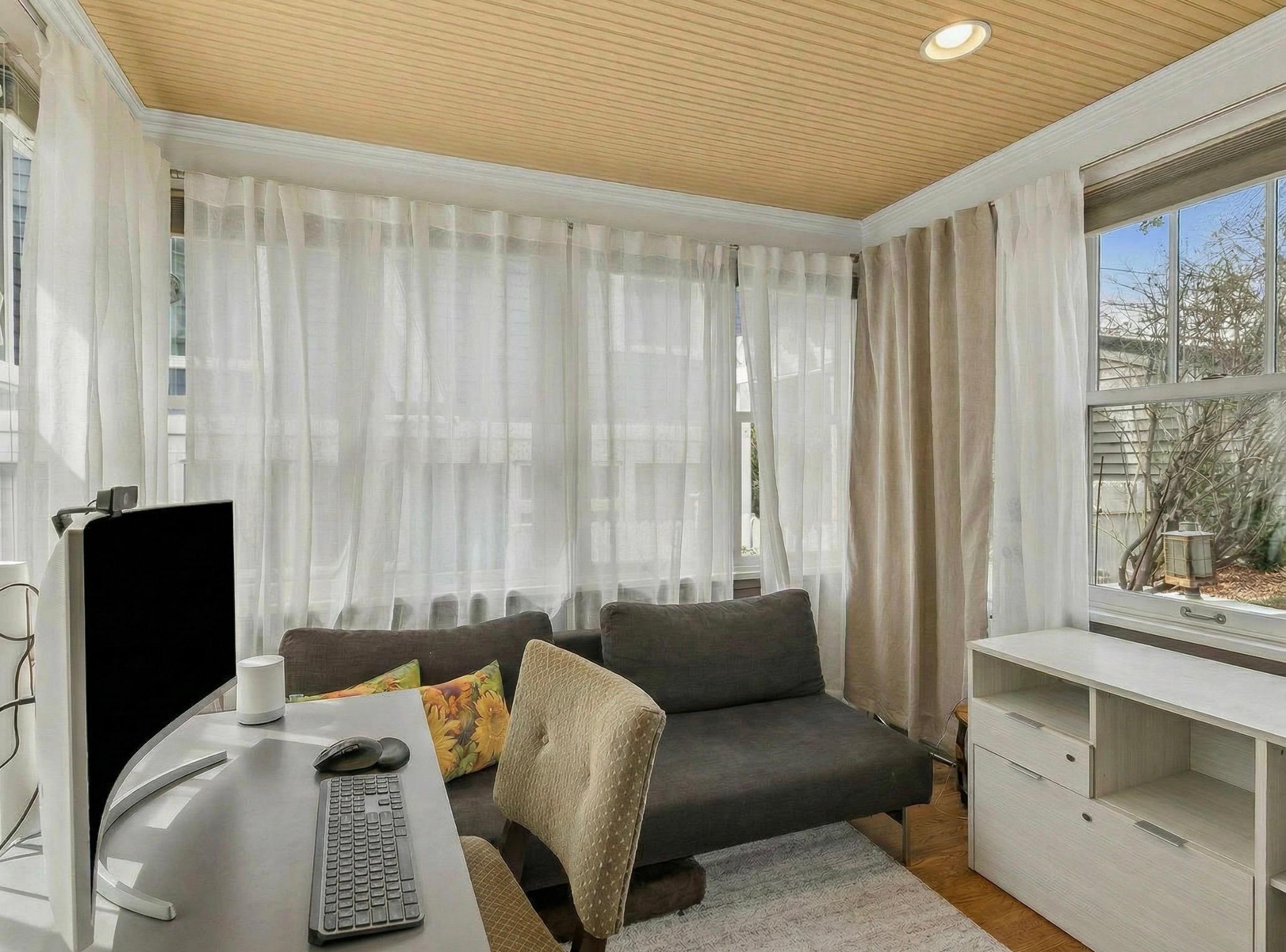 Inside, the home blends classic charm with modern updates. The custom kitchen (2022) includes new insulation, plumbing, and a quartz island. Original character shines with restored front windows and a built-in buffet, complemented by updated windows with added noise insulation.